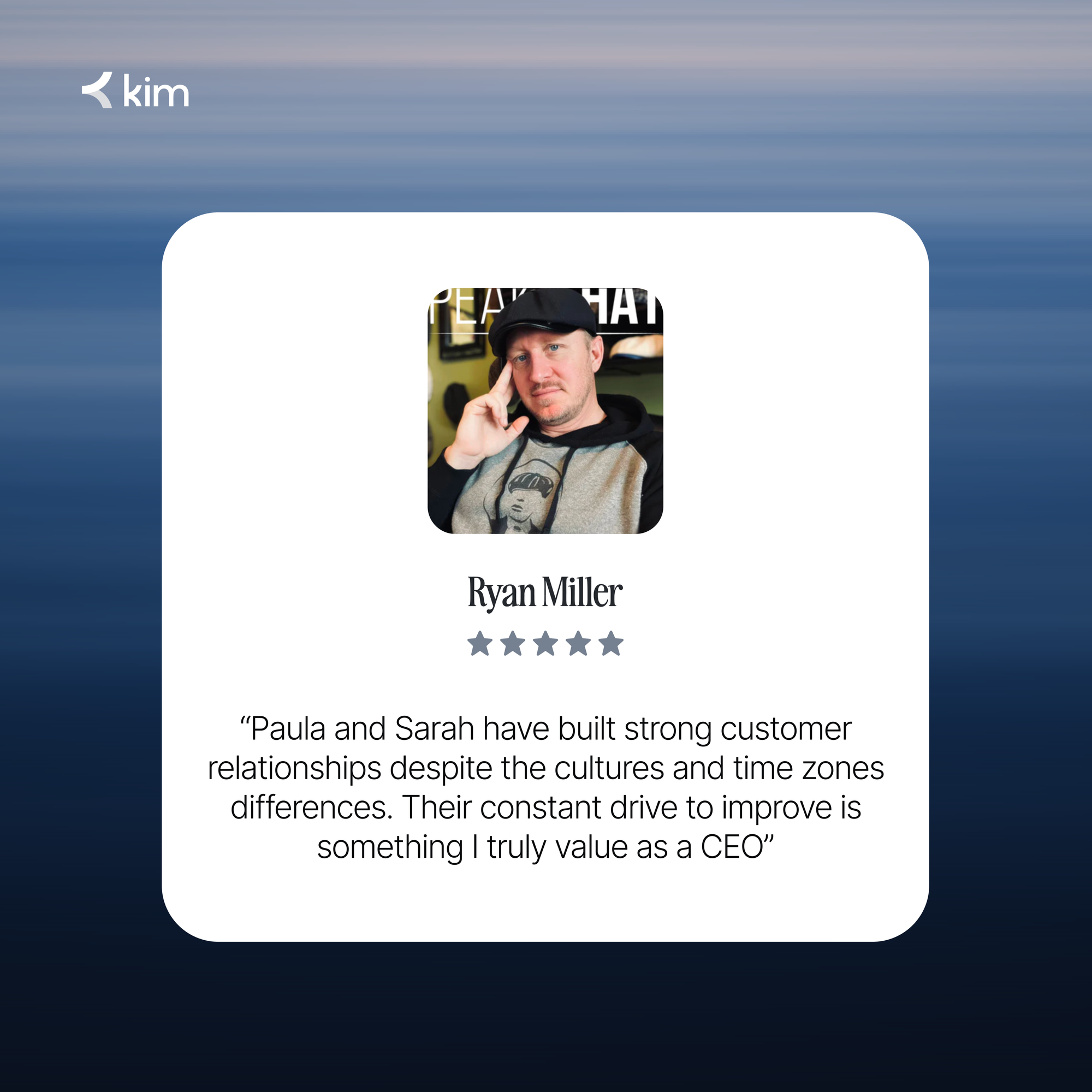 Ryan Miller, founder of Peaky Hats, had concerns about culture and time zone differences. But after working with kim.cc's superagents, he shared that they built real customer relationships and improved over time, proving that communication can be excellent when hiring is done right.